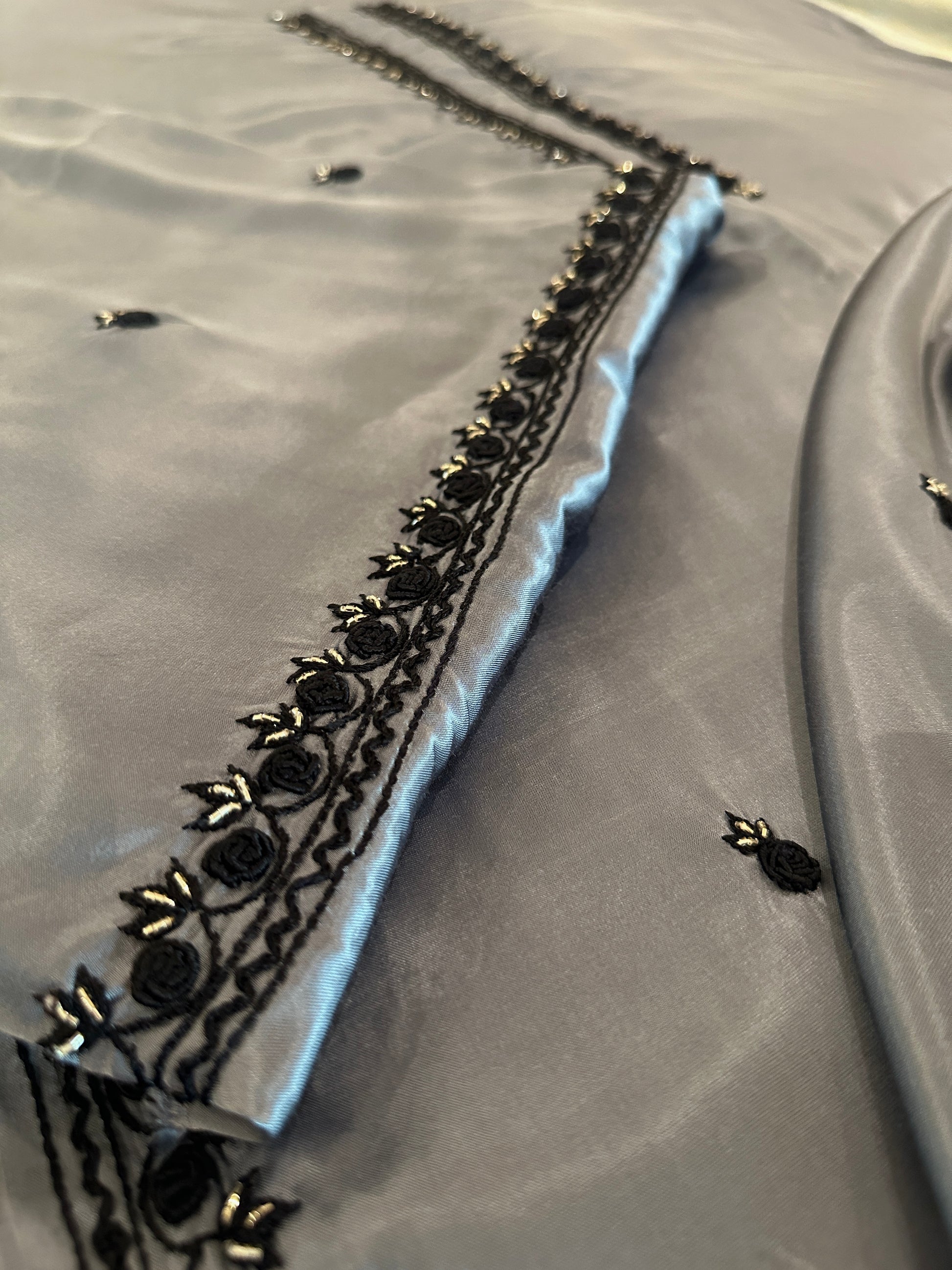 A timeless piece of luxury — Celeste Grey is adorned with delicate hand-embroidered bullion roses, petals, and sequins. Each detail is crafted over days - a piece that feels special elegant, and truly one of a kind.